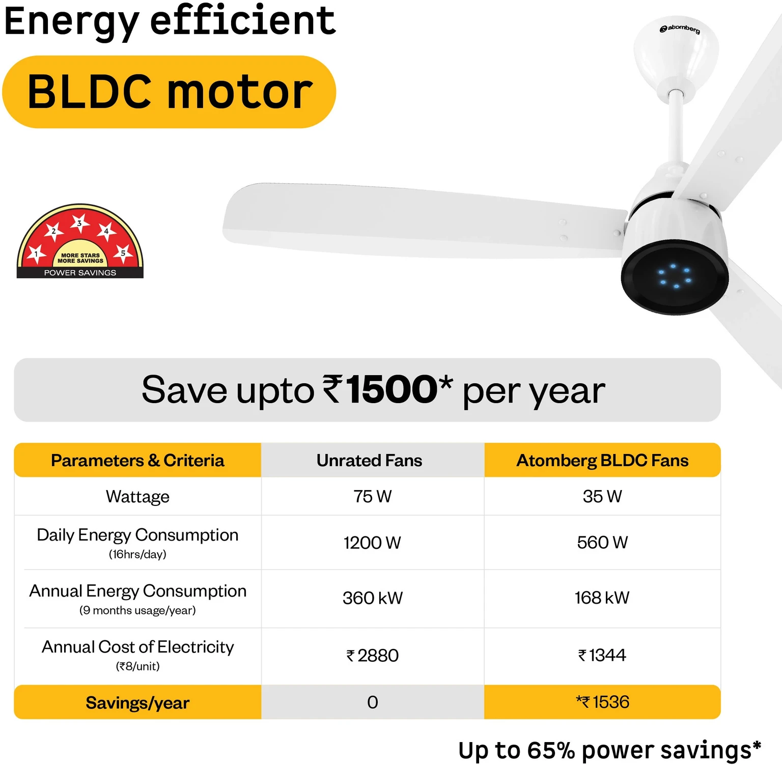 Atomberg Renesa Prime Remote|High Air Delivery|LED Speed Indicator|Low Noise|Sleek Design with 3 Year Warranty BLDC Motor with Remote 1200 mm Ceiling Fan (5 Star | Gloss White | Pack of 1)