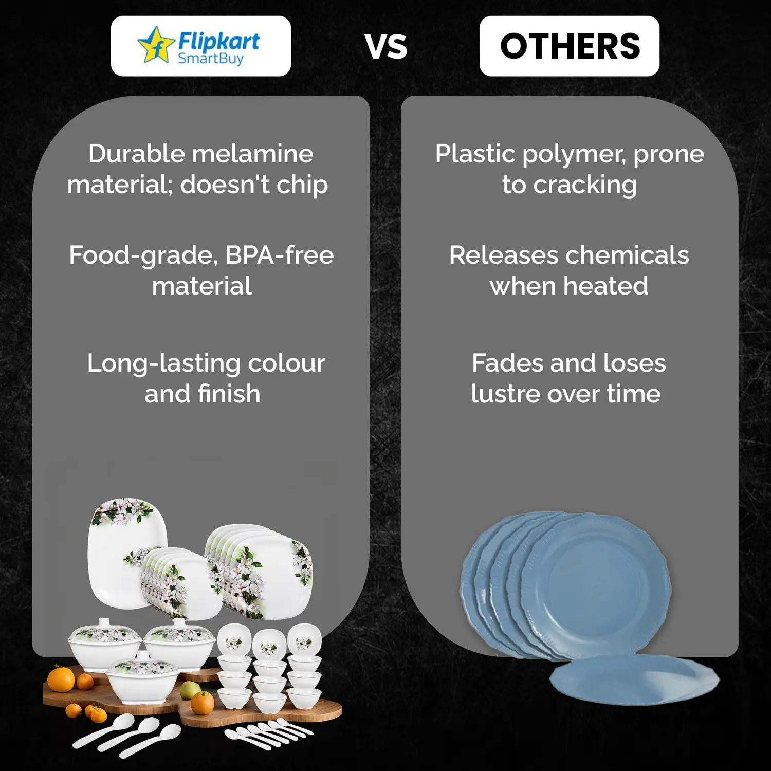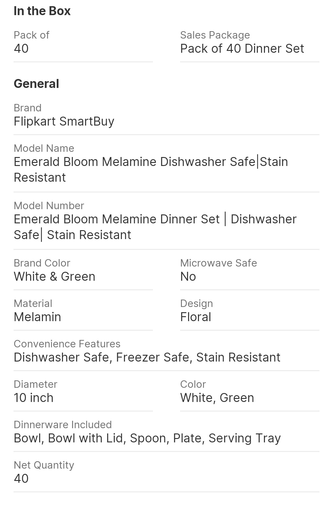 Flipkart SmartBuy Pack of 40 Melamin Emerald Bloom Melamine Dishwasher Safe|Stain Resistant Dinner Set (White, Green)